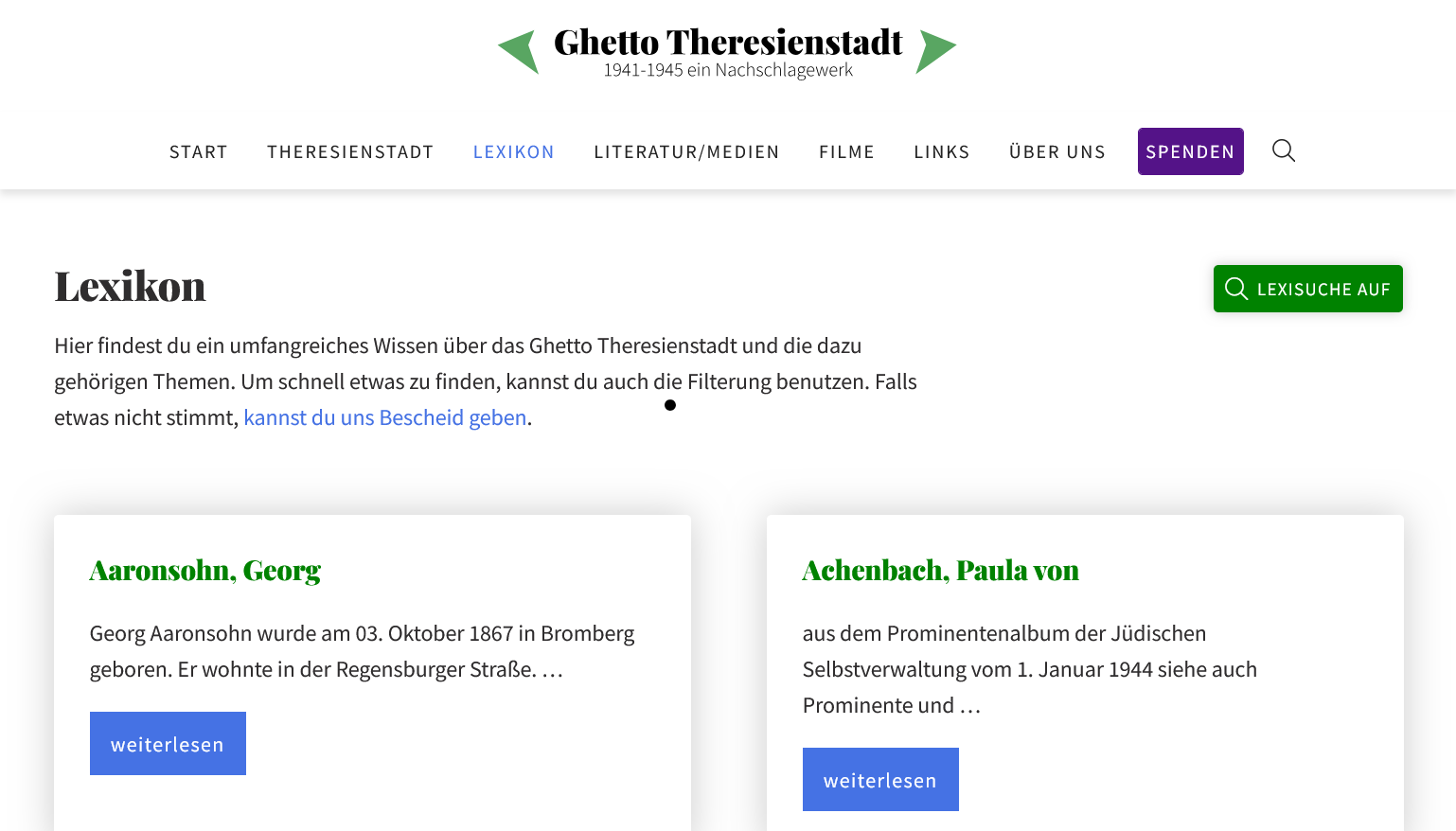 Die Jugendbegegnung Theresienstadt/Terezín e.V. erinnert daran mit einer Online-Veranstaltung, bei der gemeinsam Zeitzeug*innenvideos von Überlebenden des Aufbaukommandos gezeigt wurden. Gleichzeitig nutzen wir die Veranstaltung, um Recherchemöglichkeiten zu Theresienstadt vorzustellen. Darunter auch das Online-Lexikon, das derzeit die wichtigste Internetquelle zur Geschichte Theresienstadts darstellt und durch den Verein Jugendbegegnung Theresienstadt/Terezín e.V. gerettet und überarbeitet werden konnte.