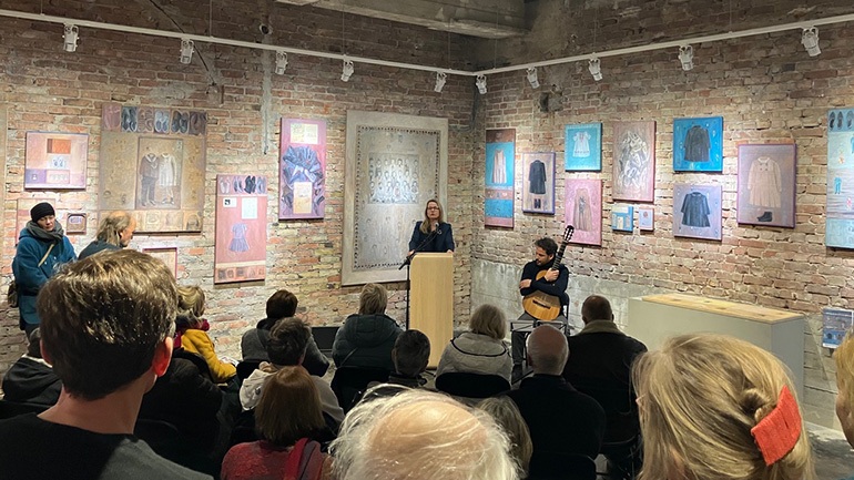 Die Laudatio hielt Dr. Gabriele Knapp aus Berlin. Sie brachte dem Auditorium die künstlerische Arbeit von Mónica Laura Weiss nahe, wobei sie u.a. auf die unterschiedlichen Techniken der Künstlerin einging wie auch auf die eng mit der Familienbiografie verwobenen Artefakte mit Bezug zu Dresden und den anderen Orten der Fluchtgeschichte. Auf die Abteilung „Bleierne Zeit“, die sich mit der Militärdiktatur in Argentinien zwischen 1976 und 1983 befasst, ging Dr. Knapp separat ein und verwies dabei auf die Kontinuität im Schaffen der Künstlerin in der Auseinandersetzung mit Unrecht und Verfolgung. Durch den von ihr entworfenen pädagogischen Leitfaden werden Schüler*innen zum selbstforschenden Lernen in der Ausstellung eingeladen.