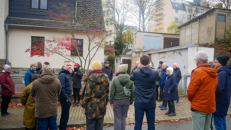 Führung zur ehemaligen Synagogenmauer (© AG Stätten der NS-Zwangsarbeit in Sachsen, 2025)
