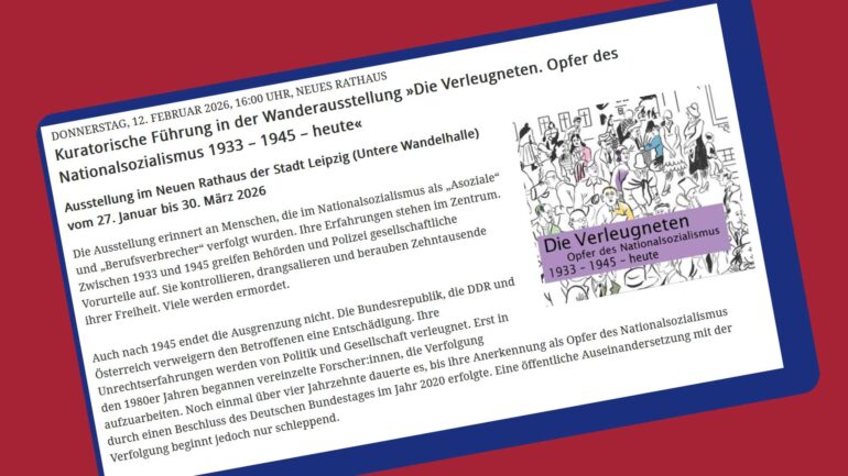 Rahmenprogramm zur Wanderausstellung „Die Verleugneten. Opfer des Nationalsozialismus 1933 – 1945 – heute” Ausstellung im Neuen Rathaus der Stadt Leipzig (Untere Wandelhalle) vom 27. Januar bis 30. März 2026